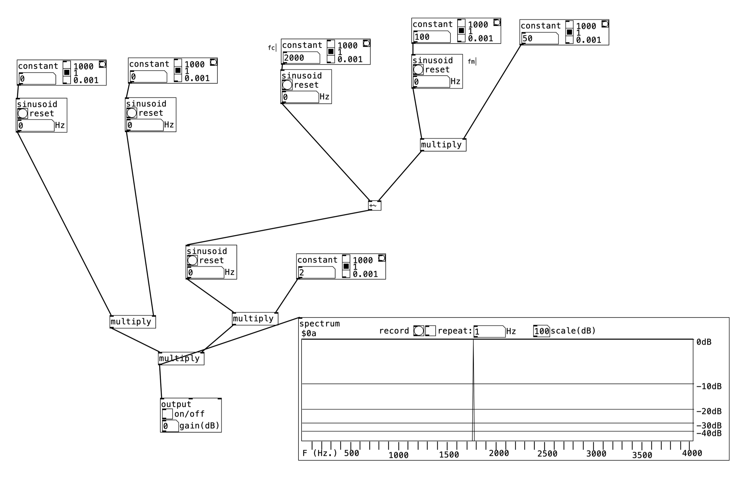 Pure Data implementation of amplitude and frequency modulation architectures with controllable carrier frequency, modulation frequency, and index.